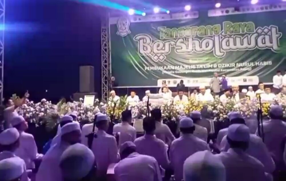 KABUPATEN TANGERANG – Gubernur Banten Andra Soni dan Bupati Tangerang Moch Maesyal Rasyid mengikuti acara Tangerang Raya Bersalawat dalam rangka pembukaan Majelis Talim dan Zikir Nurul Habib, di Stadion Mini Kecamatan Rajeg, Kabupaten Tangerang, Minggu (25/5/2025), malam.