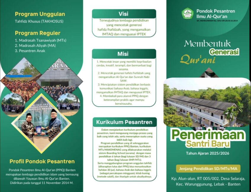 Pendaftaran SPMB PPIQ Banten Jenjang MI/MTS/MA Dibuka Untuk Umum Dan Program Tahfizd Qur’an