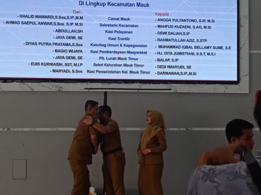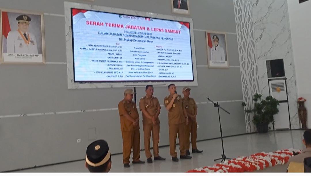 KABUPATEN TANGERANG – Pemerintahan Kecamatan Mauk melaksanakan Sertijab dari Camat Mauk yang sebelumnya   Khalid Mawardi S.IP , S.Sos , M.M  kepada Camat Mauk Baru Angga Yulya tono S.IP , M.Si , Giat acara Sertijab tersebut di gelar di Aula Kecamatan  Mauk Kabupaten Tangerang Banten.