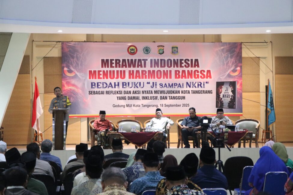 TANGERANG – Majelis Ulama Indonesia (MUI) Kota Tangerang bersama sejumlah tokoh agama, akademisi, dan aparat penegak hukum menggelar acara Bedah Buku “JI Sampai NKRI” di Aula Gedung MUI Kota Tangerang, Kamis (18/9).