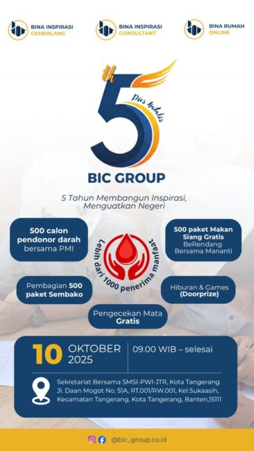 KOTA TANGERANG – Merayakan ke -5 Tahun Bina Inspirasi Cemerlang (BIC) Group yang akan diselenggarakan di Sekretariat Bersama (Sekber ) PWI ,SMSI Kota Tangerang dan JTR dengan tema