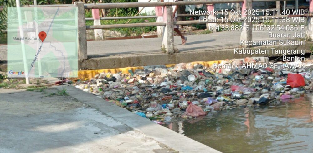 KABUPATEN TANGERANG – Tumpukan sampah berserakan di aliran sungai jembatan kebon kelapa Desa Pekayon Kecamatan Sukadiri Kabupaten Tangerang membuat pemandangan disekitar lokasi itu tampak jorok hingga mengeluarkan aroma tak sedap.