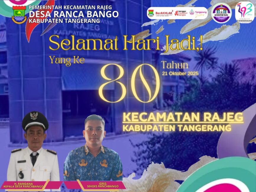 KABUPATEN TANGERANG – H.Ramdana Kepala Desa Rancabango Beserta Jajaran Mengucapkan Selamat Hari Jadi Kecamatan Rajeg Yang Ke 80 Tahun“Semoga Semakin Maju,Berdaya Saing,dan menjadi kawasan yang sejahtera bagi seluruh Masyarakatnya terus Berinovasi untuk Rajeg Yang Lebih Baik“.Semoga acara hari jadi Rajeg ke 80 dapat terselenggara dengan lancar.