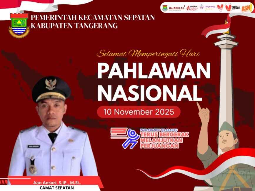 Aan Ansori S.IP.M.Si Camat Sepatan Kabupaten Tangerang Provinsi BantenĀ  Mengucapkan Selamat Hari Pahlawan 10 November 1945 – 2025, Pada Hari Pahlawan ini, mari kita sambut masa depan dengan semangat pahlawan, yaitu semangat keberanian, keadilan, dan persatuan,mari kita bangkitkan semangat kebangsaan untuk menciptakan Indonesia yang lebih maju dan adil
