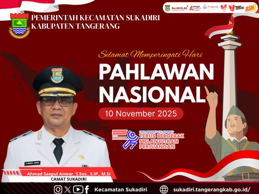 Ahmad Saepul Anwar.S.SoS.S.iP.M.Si Camat Sukadiri Kabupaten Tangerang Provinsi BantenĀ Mengucapkan Selamat Hari Pahlawan 10 November 1945 – 2025, Pada Hari Pahlawan ini, mari kita sambut masa depan dengan semangat pahlawan, yaitu semangat keberanian, keadilan, dan persatuan,mari kita bangkitkan semangat kebangsaan untuk menciptakan Indonesia yang lebih maju dan adil.