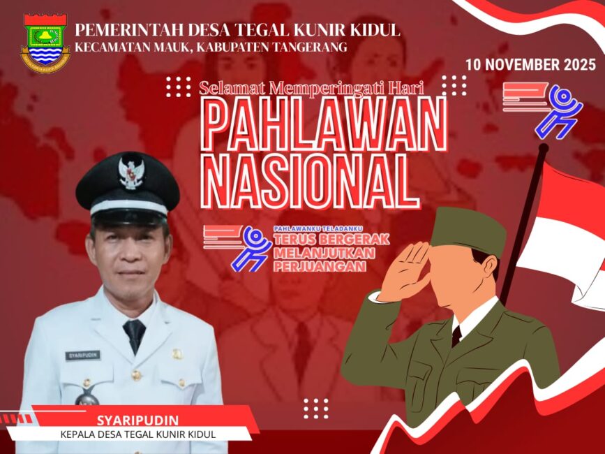 Syaripudin Kepala Desa Tegal Kunir Kidul Kecamatan Mauk Kabupaten Tangerang Provinsi Banten Mengucapkan Selamat Hari Pahlawan 10! November 1945 – 2025, Pada Hari Pahlawan ini, mari kita sambut masa depan dengan semangat pahlawan, yaitu semangat keberanian, keadilan, dan persatuan,mari kita bangkitkan semangat kebangsaan untuk menciptakan Indonesia yang lebih maju dan adil.