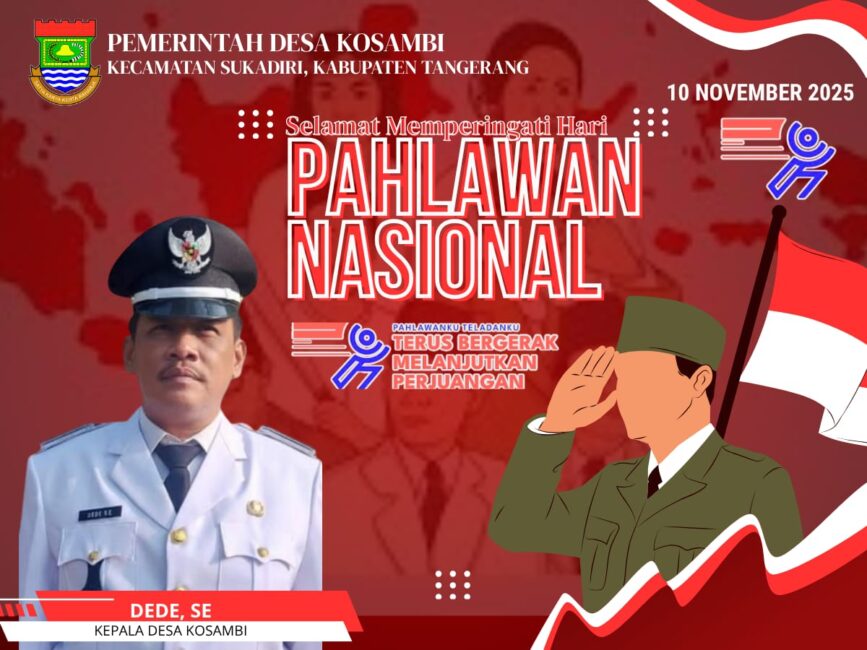 KABUPATEN TANGERANG – Dede.SE Kepala Desa Kosambi Kecamatan Sukadiri Kabupaten Tangerang Mengucapkan Selamat Hari Pahlawan Nasional 10 November 1945 – 2025“Kami teruskan api juangmu wahai pahlawan, mengisi kemerdekaan dengan harapan tak berkesudahan. Api semangat Hari Pahlawan menyala, jiwa berkorban demi negeri tercinta, pahlawan tak gentar, merajut kemerdekaan, tumpah darah suci, dalam langkah berani.