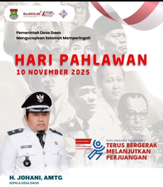 Begitu juga Pemdes Daon , Kecamatan Rajeg Kabupaten Tangerang Banten Indonesia, H.Johani , AMTG selaku Kepala Desa Daon mengucapkan Hari Pahlawan , Rasa syukur yang penuh khidmat yang amat dalam atas jasanya para pejuang kemerdekaan yang telah mengorbankan segenap jiwa raga ,harta benda demi Kedaulatan Kemerdekaan Negara Kesatuan Republik Indonesia, Dan kini   Terus Bergerak Melanjutkan Perjuangan, mengisi dengan baik dan semangat membangun bangsa dan negara demi kemajuan Bangsa Indonesia yang sejahtera dan sentosa , Selamat Hari Pahlawan , 10 November 1945 – 10 November 2025 , Jaya selalu Bangsaku.