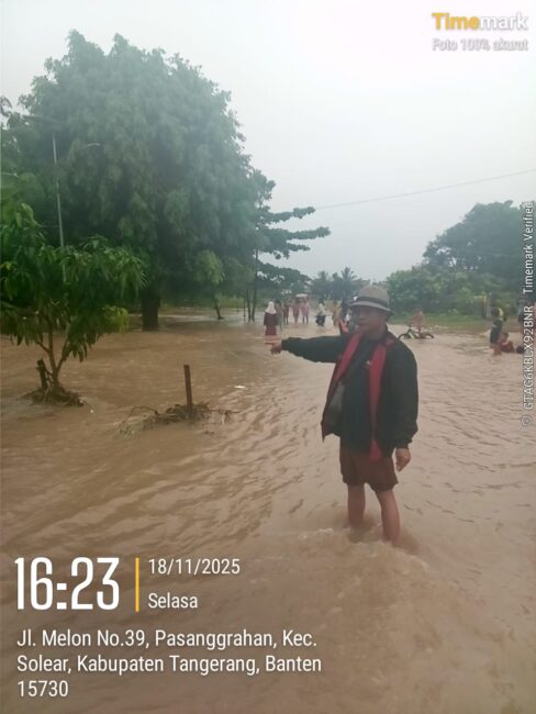 KABUPATEN TANGERANG – Hujan deras yang mengguyur wilayah Kabupaten Tangerang khususnya di Kecamatan Solear pada Selasa 18 November 2025 menyebabkan banjir di Perumahan Taman Kirana Surya, Desa Pasanggrahan, akibat aliran sungai meluap.
