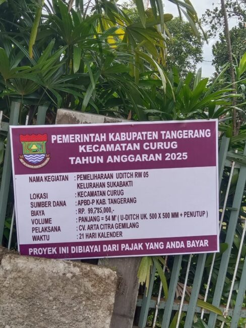 Dari informasi di lapangan Proyek tersebut bersumber dari aspirasi Dewan Imam (PKS) dapil V, yang dikerjakan oleh CV. Arta Citra Gemilang, bersumber dari Anggaran Pendapatan dan Belanja Daerah (APBD-P) Kabupaten Tangerang, tahun 2025 dengan nilai kontrak Rp.99.785.000, masa kerja 21 hari kalender.