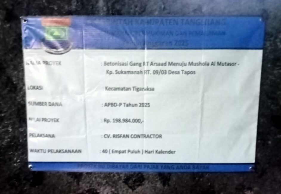 KABUPATEN TANGERANG – Realisasi proyek betonisasi gang RT Arsaad menuju Mushola Al Mutasor Kp. Sukamanah RT 09/03 desa Tapos Tigaraksa, diduga dikerjakan asal asalan untuk meraup keuntungan lebih besar. Sehingga, mengabaikan standard kualitas yang telah di tetapkan dalam Rencana Anggaran Belanja (RAB).