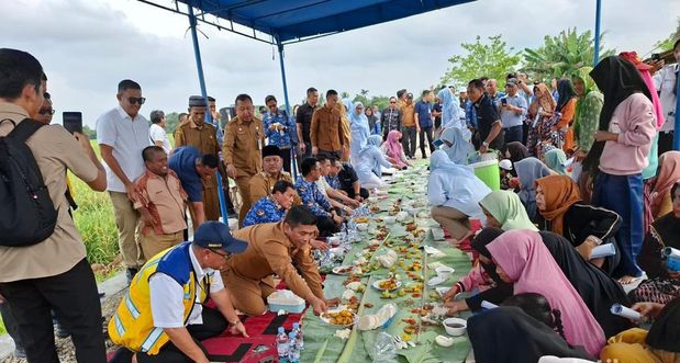 Gubernur Banten Andra Soni botram bareng warga saat peresmian perbaikan Jalan Desa di Badak Anom, Sindang Jaya, Kabupaten Tangerang. (Arief/detikcom)