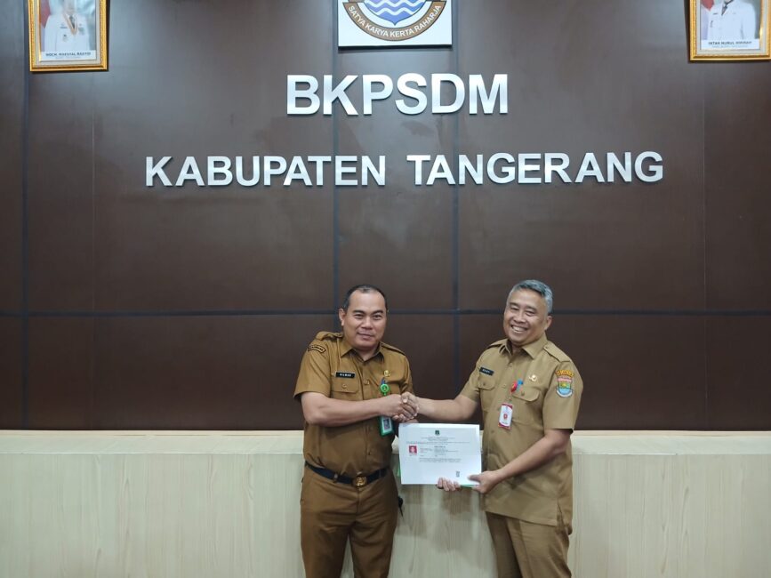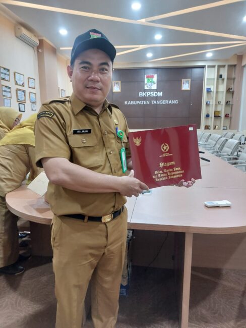 KABUPATEN TANGERANG – Ahmad Hilman S.H Sekretaris Kelurahan Pakuhaji Kecamatan Pakuhaji Kabupaten Tangerang Banten Indonesia menerima Satyalencana Karya Setya X Tahun dan Sertifikat Barjas angkatan I Tahun 2025 yang diberikan oleh BKPSDM Kabupaten Tangerang bertempat di Aula BKPSDM Kabupaten Tangerang , Selasa Tanggal 27 Januari 2026  yang diberikan langsung oleh Kepala BKPSDM H.Beny Rahmat S.H