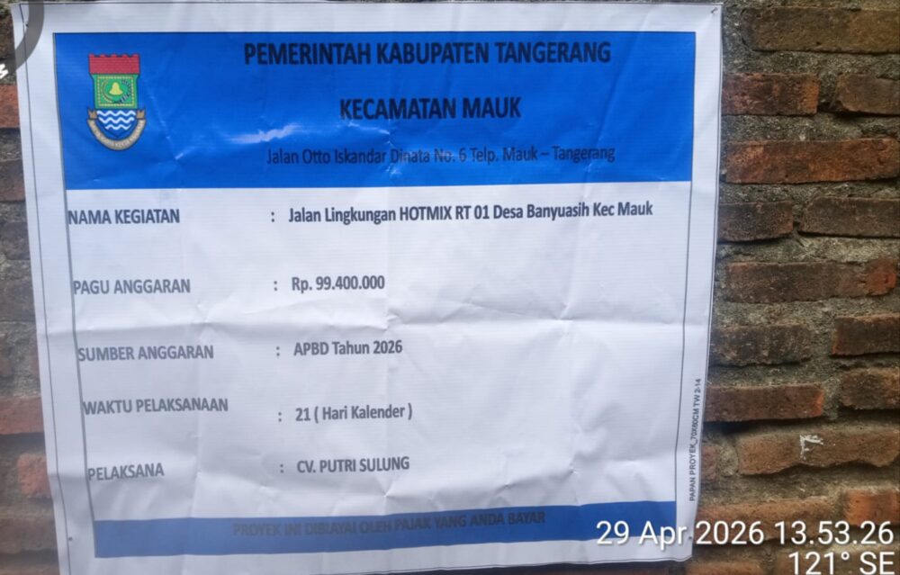 KABUPATEN TANGERANG – Proyek Jalan Lingkungan Hotmix  RT 01  Desa Banyu Asih Kecamatan Mauk Kabupaten Tangerang,Anggaran Pendapatan dan Belanja Daerah (APBD) Kabupaten Tangerang melalui Kecamatan Mauk Tahun Anggaran 2026 Nilai Anggaran RP, 99,400,000.,21 (Hari Kalender) di kerjakan oleh pihak ketiga CV.Putri Sulung Terlihat ada Pembiaran Dan asal jadi,Kamis (30/04/2026).